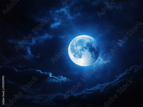 A beautiful blue moon shines through the dark clouds, creating a mystical atmosphere in the night sky.