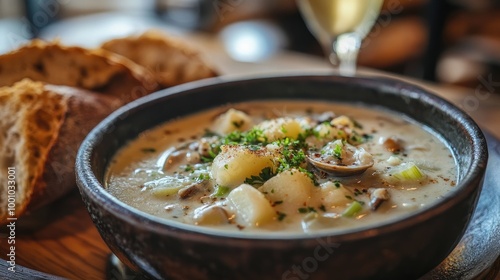 A beautiful bowl of clam chowder with chunks of tender clams, potatoes, and celery, served with a side of crusty bread in a cozy, inviting setting.
