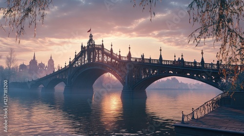bridge, water, river, sky, sunrise, sunset, architecture, building, europa, spain, seville, piazza, park, city landscape, landmark, travel, tour tourism, dusk, dawn, cloud, landscape, outdoors, scenic, tranquil, peaceful, ornate, artistic, elegant, picturesque, history, romantic, vacation, destination, light, nature, beauty, urban, riverside, structure, arch, willow, branch, flag, palace, spanish, sun