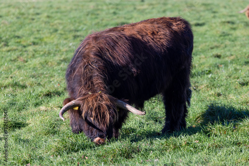 A beautiful brown highland cow grazing in a field in the Autumn time