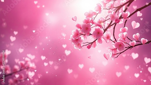 a beautiful cherry blossom tree branch with pink flowers in full bloom. Hearts are floating in the air around the tree, symbolizing love and romance. The backdrop has a soft. Generative AI