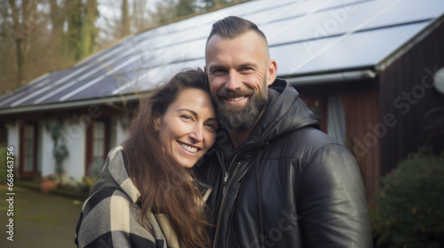 A beautiful couple in love stands next to their house with solar panels on the roof