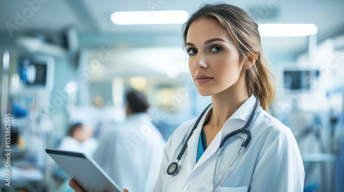 doctor, female, hospital, white coat, tablet, patient, health care, medicals, standing, professional, attentive, hospital room, healthcare professional, medical equipment, physician, health, serious, woman, medical professional, confident, caring, sharpened, medicine, technology, medical care, clinician, medical treatment, medical practice