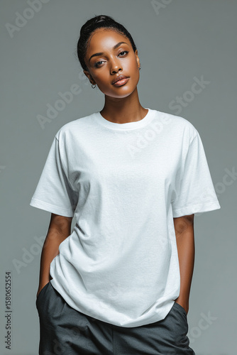 A beautiful female model wearing a white t-shirt. A product shot for fashion and apparel. best use for mockup.