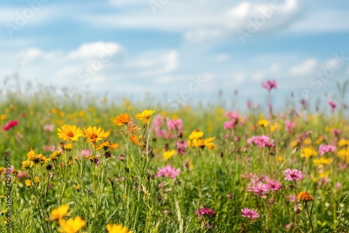 flower, field, landscape, nature, sunny, day, blue, sky, green, grass, blooming, garden, plant, beauty, peaceful, serene