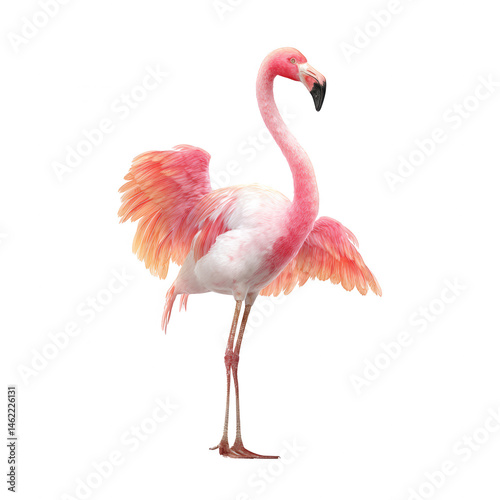 A beautiful flamingo stands gracefully with its wings partially spread on a clean white background scene.
