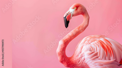 A beautiful flamingo with pink feathers and a long graceful neck stands in front of a pink background.