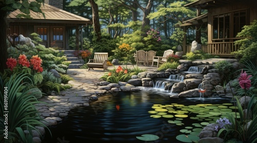 A beautiful garden with a pond, waterfall, and flowers. There is a house in the background and two chairs in the foreground.