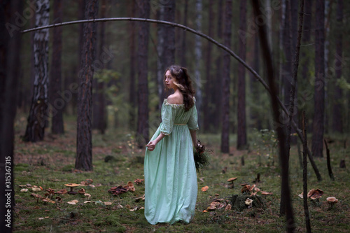 a beautiful girl in a green dress walks in the forest with a bouquet