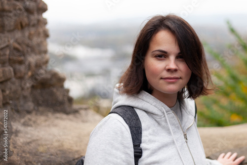 A beautiful girl in a hoodie with a backpack stands against the backdrop of the ruins of a fortress and a blurred landscape behind her.