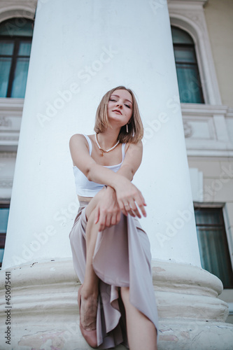 a beautiful girl in a skirt and top walks near the theater, looks into the frame, portrait, city girl