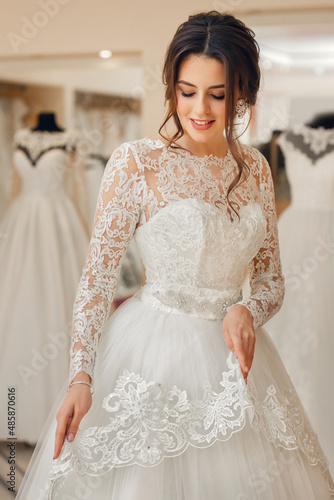 A beautiful girl or woman in a bridal salon tries on a beautiful wedding dress with lace and embroidery. Long dress with wide tulle skirt. dress details close-up
