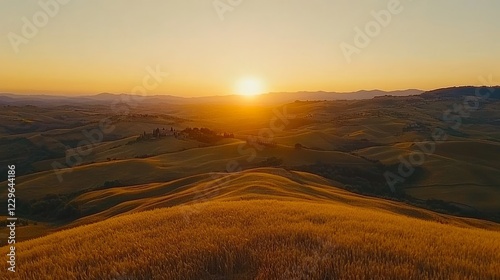 A beautiful golden sunset over rolling hills, with a golden wheat field in the foreground and a distant mountain range, creating a warm, tranquil, and scenic landscape.