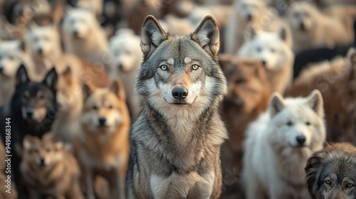 A beautiful grey wolf stands staring at the camera among thousands of different German shepherd dogs.