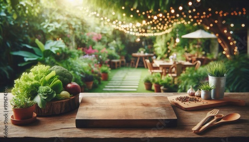 A beautiful image of Empty wooden table with garden bokeh for a catering with a country theme and food. Stock photography