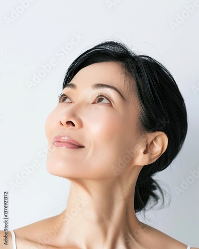 beautiful, japanese, woman, 50s, clear, skin, smooth, glowing, complexion, looking, up, sky, white, background, short, black, hair, tied, back, 1, side, make-up, face, dressed, simple, attire, photo, upper, body, shot, smiling, softly, upwards, toward, sunlit, horizon, eye, sparkle, joy, serene, beauty, nature, captured, style, iso