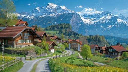 A beautiful landscape of a small village in the Swiss Alps. AI.