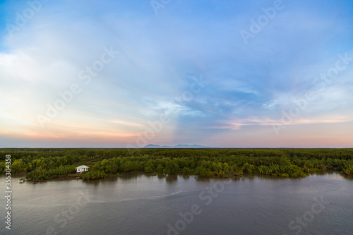 A beautiful landscape of a vietnamese forest with the Saigon River in the foreground with a spectacular sky.