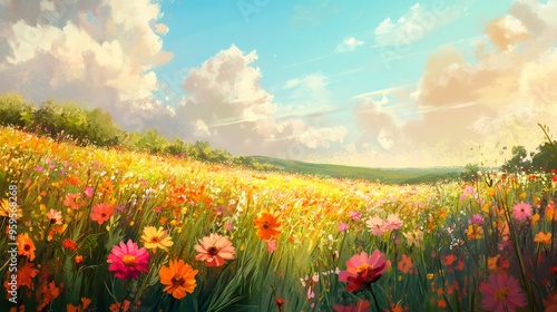 flower, field, meadow, bloom, colourful, sky, cloud, summer, nature, wildflower, green, grass, landscape, painting, art, bright, yellow, pink, orange, red, white, blue, sunlight, sunshine, vibrant, natural, floral, beauty, scenic, delicate, foliage, floral background, wild, growth, blossom, flower petals, garden, rural, idylli, fresh, peaceful, daisy, cosmos, wildflower