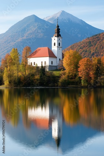 A beautiful mountain with a church in the distance. The church is white and red. The water is calm and reflects the mountains and the church