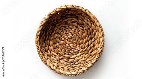 A beautiful, natural fiber basket with a warm, earthy tone, isolated on a white background, top view