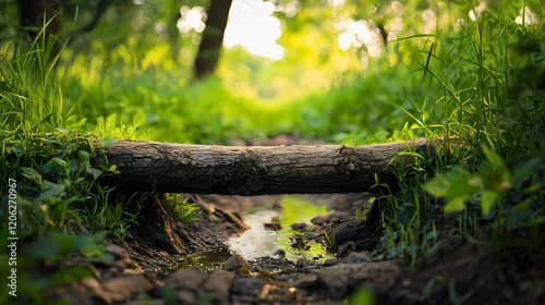 A beautiful natural scene of a branch connecting two ends, with a small canal flowing underneath it. The branch bridges the forest.