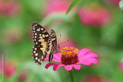 A beautiful painted lady butterfly with colorful wings rests on a vibrant flower in a summer garden