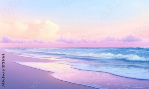A beautiful pastel colored beach scene with ocean waves gently crashing
