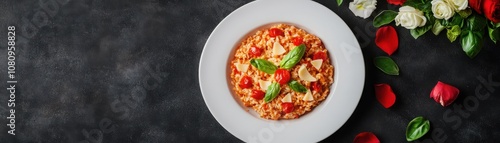 A beautiful plate of pizza topped with fresh tomatoes and basil, surrounded by rose petals on a dark background.