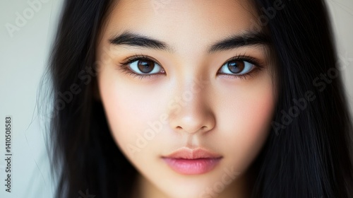 face, eye, skin, hair, dark, black, brown, lip, nose, beauty, portrait, close, up, young, woman, natural, light, soft, smooth, healthy, flawless, eyebrow, lash, gaze, make-up, complexion, cheek, forehead, detail, expression, front, studio, elegance, asian, serene, calm, delicate, innocent, aesthetic, sharpened, center, symmetry, honed, glow, radiance, youthful, person