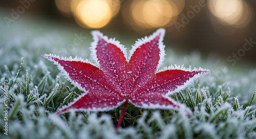 A beautiful red maple leaf covered in delicate white frost, a stunning symbol of the transition from autumn to winter.