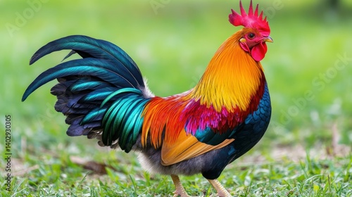 bird, rooster, fowl, animal, plumage, feather, colourful, vibrant, bright, red, orange, yellow, blue, green, purple, black, crest, wattle, beak, eye, leg, claw, grass, outdoors, nature, farm, countryside, domestic, poultry, portrait, profile, proud, elegant, detail, texture, pattern, shiny, illumination, springtime, agriculture, wild, alive, life, avian, male, standing, closeup