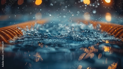A beautiful scene of water splashes around a swimming pool lane marker during evening, highlighting reflections and movements under the warm lights.