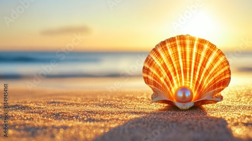 A beautiful shell holds a pearl on a sandy beach