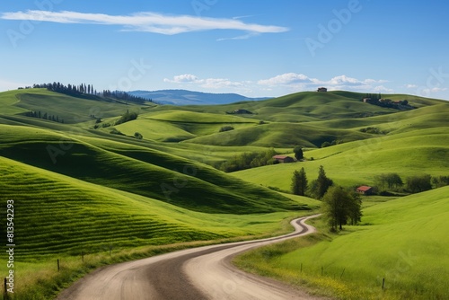 A beautiful summer or spring landscape with green grass on the hills and green fields. The blue sky is filled with white clouds and bright sunlight. Nature as a background.