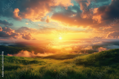 a beautiful sunset over a grassy valley with clouds in the sky and a sun setting over the hills in the distance
