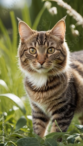cat, tabby, garden, greenery, nature, felino, pet, outdoors, animal, beautiful, serene, natural, green eye, fur, grass, wildlife, curiosity, calm, peaceful, domestic cat, elegant, fluffy, sitting, animal portrait, lush, backyard, plant, calmness, regal