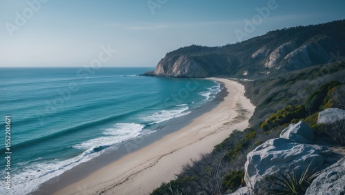A beautiful view of a beach and ocean with a rocky hill in the background. The sky is clear and the water is calm.