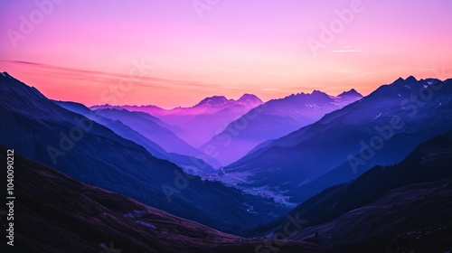 A beautiful view of the mountains at dusk, with the last rays of sunlight lighting up the peaks and the sky slowly turning purple and orange.