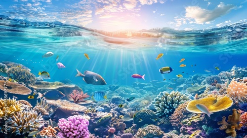 A beautiful view of the seabed during the day, with lots of coral and sea animals swimming, depicting a peaceful atmosphere.