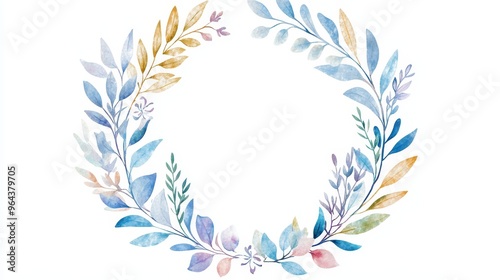 A beautiful watercolor wreath featuring delicate leaves in soft pastel colors, perfect for invitations and decor.
