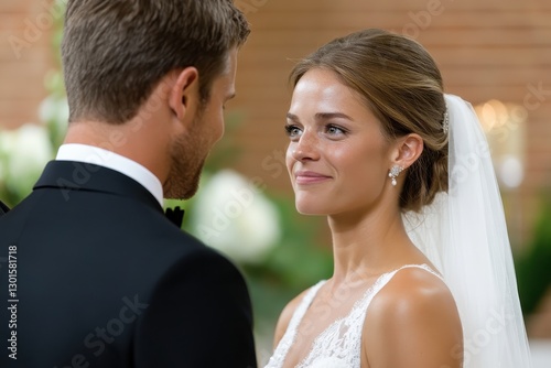 A beautiful wedding scene captures the loving gaze between a bride and groom as they share their vows, surrounded by flowers and a warm, intimate setting.