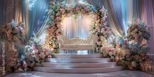 wedding, stage, flower, sofa, decoration, romantic, celebration, event, design, arrangement, ceremony, reception, bouquet, bloom, blossom, furniture, elegance, luxury, style, love, marriage, bride, groom, party, anniversary, floral, display, centrepiece, art, pastel, colours, scene, indoor, setting, detail, ornament, textile, fabric, curtain, arch, structure, step, platform
