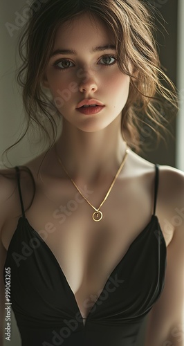 A beautiful woman with brown hair, wearing a black halter dress and a gold...