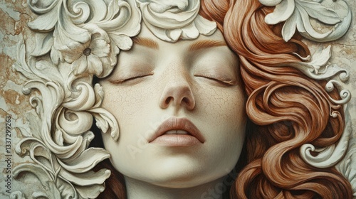 woman, face, eye, closed, hair, red, artwork, floral, ornament, carving, sculpture, detail, aesthetic, art, beautiful, serene, calm, peaceful, skin, texture, crack, delicate, portrait, visage, relief, marble, stone, white, cream, brown, expression, feature, lip, nose, cheek, forehead, design, elegance, grace, soft, light, background, decor, romantic, fantasy, gentle