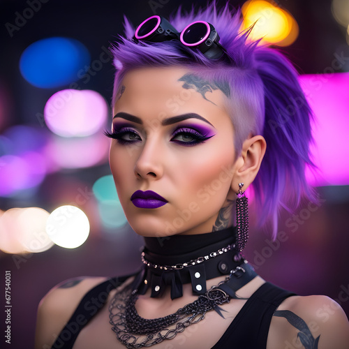 A beautiful woman with pink hair leather outfit and tattoos