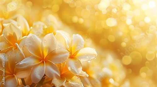 A beautiful yellow background with golden rays of sunlight shining on the delicate petals of frangipani flowers, creating an enchanting and dreamy atmosphere.