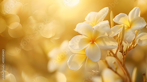 A beautiful yellow background with golden rays of sunlight shining on the delicate petals of frangipani flowers, creating an enchanting and dreamy atmosphere.