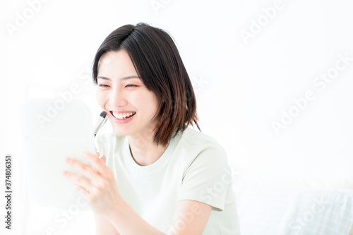 woman, young, home, smile, smiling, home, chinese, japanese, korean, asian, 20, 30, portrait, single, person, 1, beautiful, beauty, elegant, lovely, short hair, black hair, skincare, maintenance, mirror, makeup brush, happy, drink, white, people, bed, glasses, tea, water, drinking, morning, lifestyle