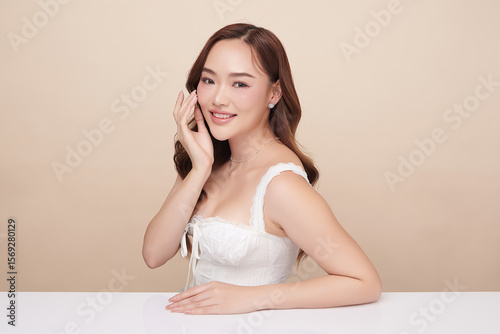 A beautiful young Asian woman with clean, fresh skin against a beige background. Skincare, facial treatment, cosmetology, beauty, and spa. An elegant portrait of an Asian woman.